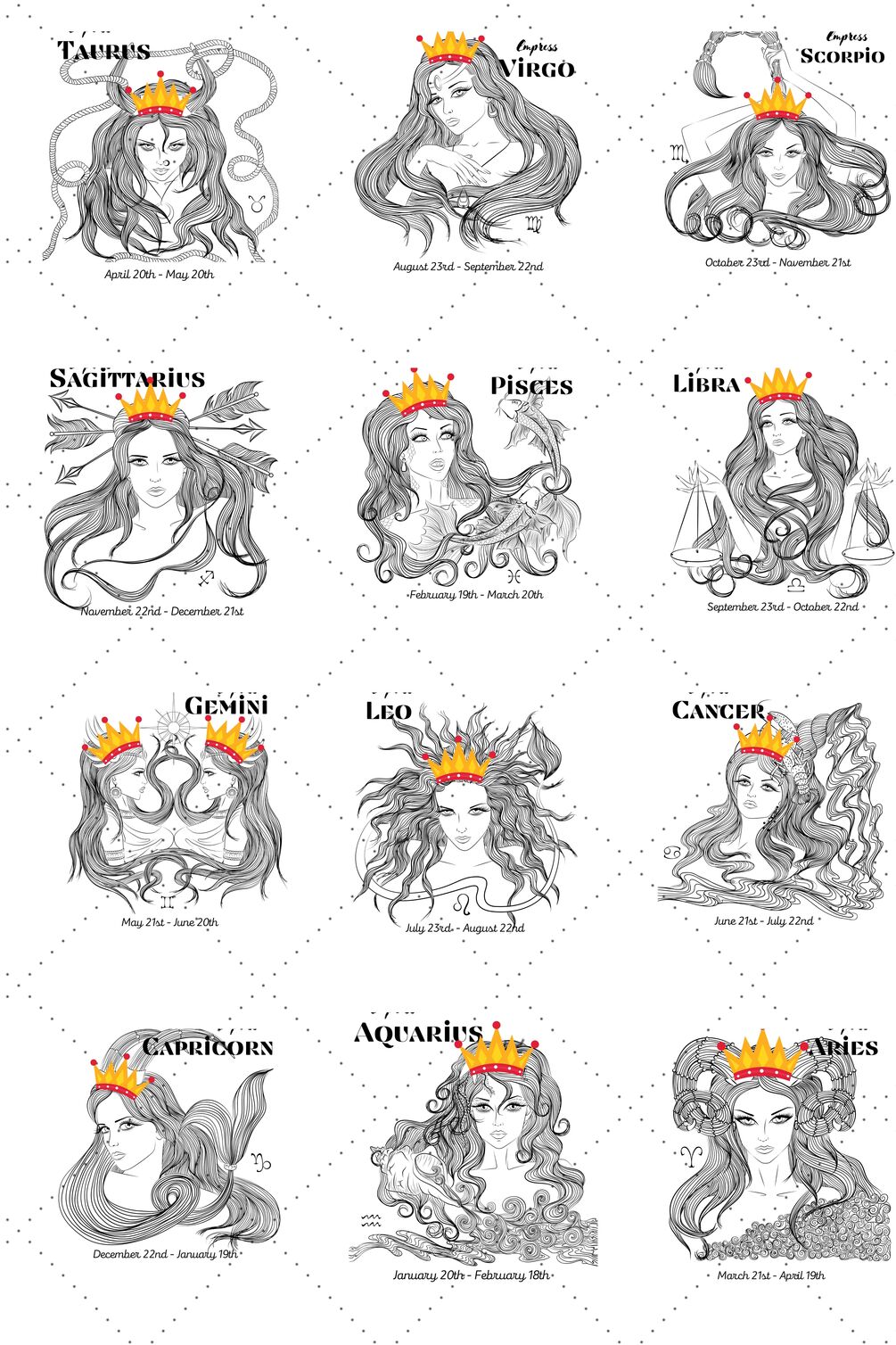 Bundle of 12 Empress Zodiac Sign SVG, SVG Bundle, Horoscope svg png, Mug Design, T-Shirt Design, Accessories Design, Digital Download